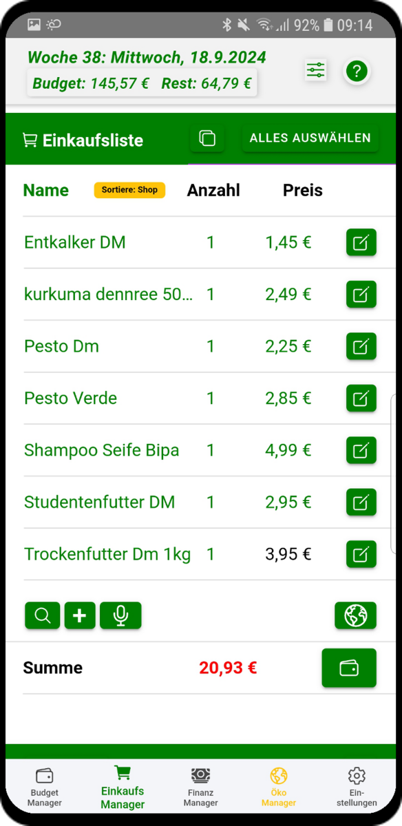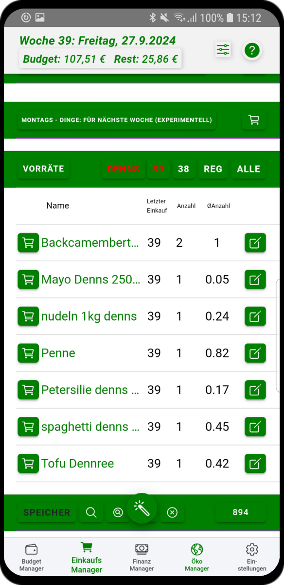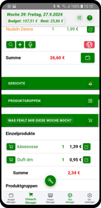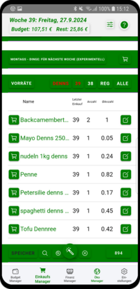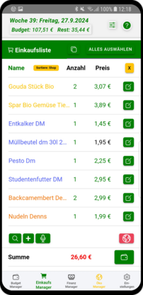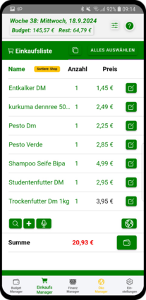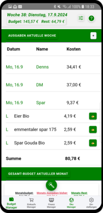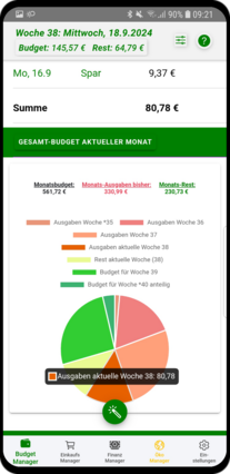 verschafft dir schnell einen Überblick über deine Einkäufe der aktuellen Woche. Aber er zeigt dir auch immer das Gesamtbudget des Monats aufgeteilt auf die Wochen des Monats an. So siehst du immer sofort, wieviel schon weg ist (Rot-Töne) bzw wieviel noch da ist (Grün - Töne).