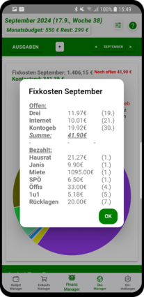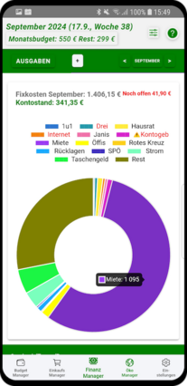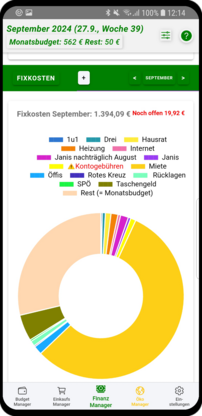 zeigt dir nicht nur auf einen Blick wie es im aktuellen Monat um deine Finanzen steht, welche Abbuchungen noch anstehen. Basierend auf deinen Angaben (monatliche Einnahmen und regelmäßige Fixkosten) ermittelt der Finanzmanager das dir in jedem Monat für deine Einkäufe zur Verfügung stehende Monatsbudget und entsprechend das Wochenbudget. Mehr ...