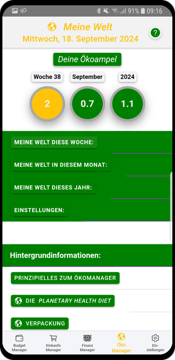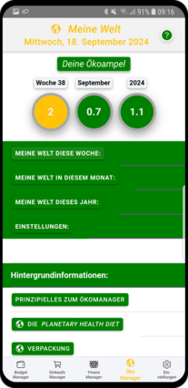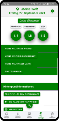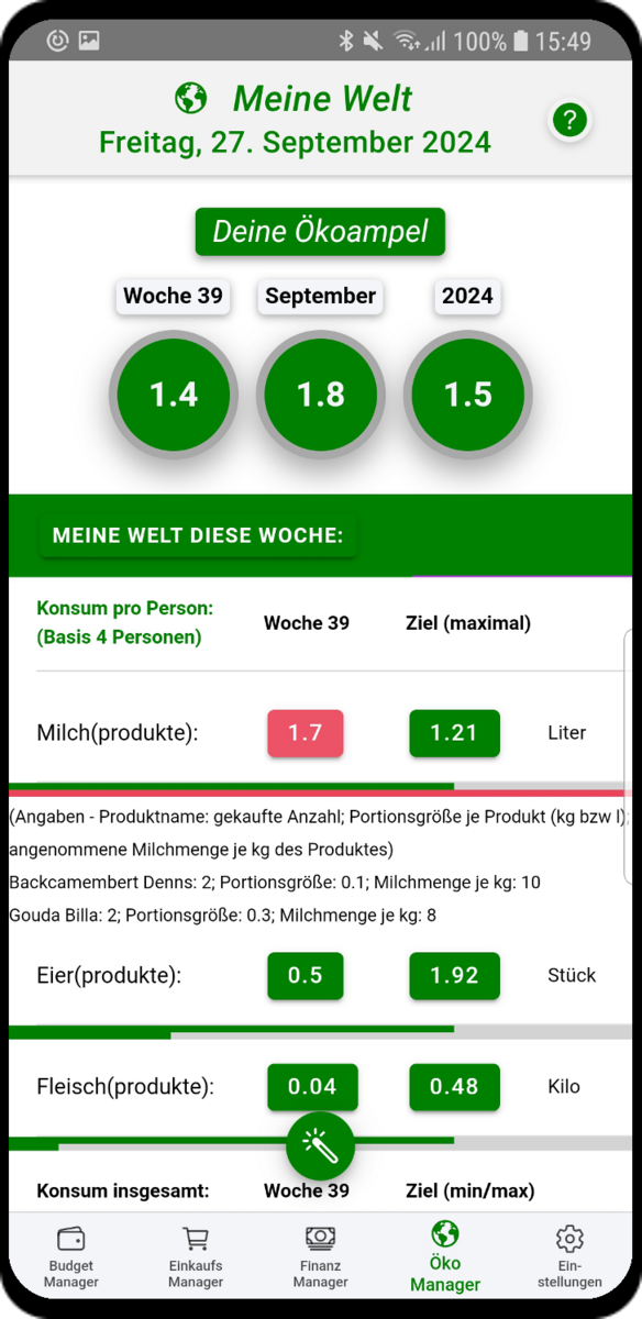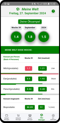 erlaubt dir nicht nur eigene Ziele für deinen Konsum festzulegen, er bringt auch viele Hintergrundinformationen mit und zeigt dir mit einem Blick, wie gut deine Einkäufe zu deinen Zielen passen: In der aktuellen Woche, im Monat und im Jahr. Mehr ...