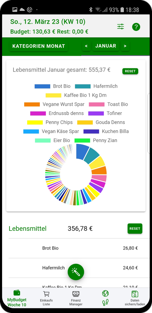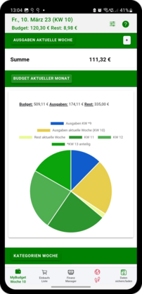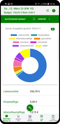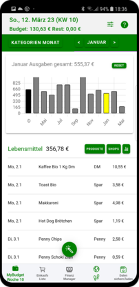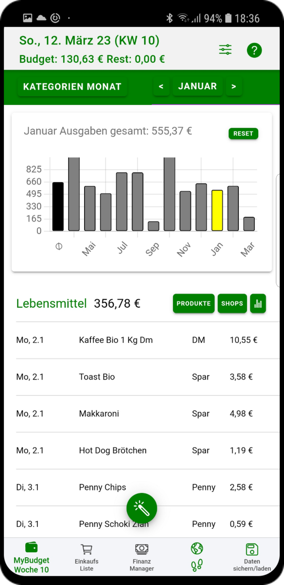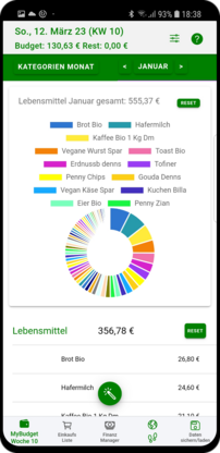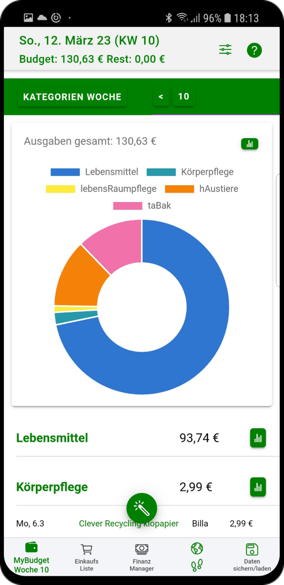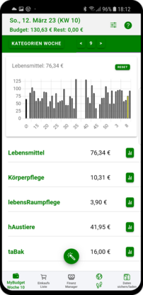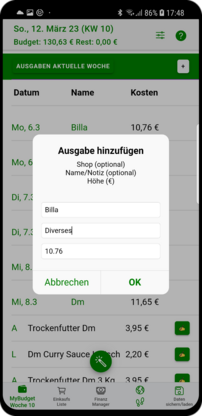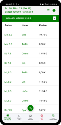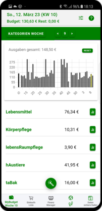 Ebenfalls auf einen Blick siehst du deine Ausgaben der aktuellen Woche, natürlich nur, wenn du sie auch eingetragen hast. Du kannst dies entweder im ersten Tab ganz einfach in der Summe angeben, z.B.: Billa 10.76 € oder du benutzt dazu die Einkaufsliste, die noch viele weitere Funktionen bietet. Dann siehst du auch die gekauften Artikel.