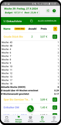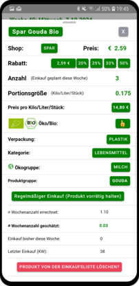 Wenn du auf den Namen des Produktes in der Einkaufsliste klickst, siehst du in welchen Wochen du das Produkt gekauft hast und die entsprechend berechnete Durchschnittsmenge pro Woche ("errechnet") und die von dir geschätzte Menge, die du immer selbst angeben kannst.