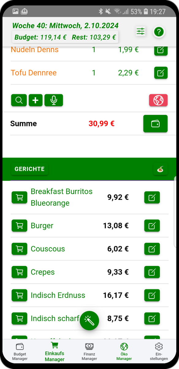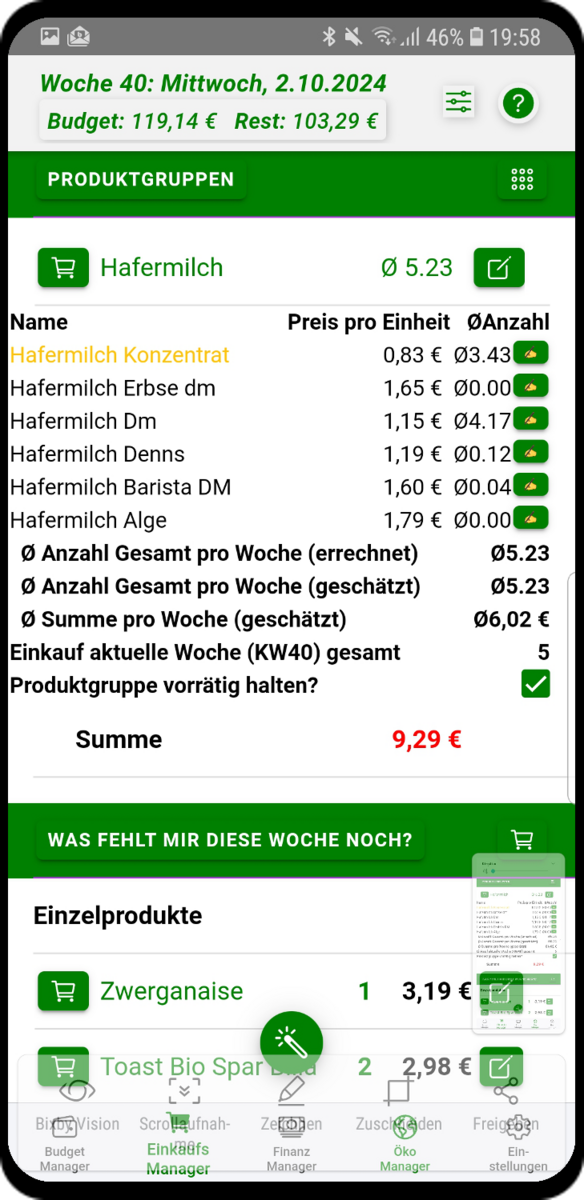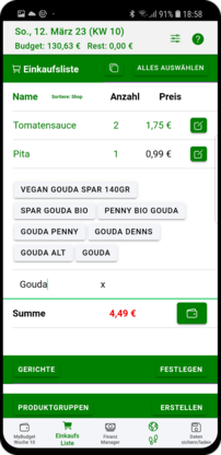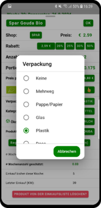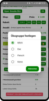 Das Addieren neuer Artikel wurde bedienungseffizient gestaltet: Nach dem Klick auf das + oder ein einfaches Tippen in die Zeile dahinter, gibt man den Namen ein; nach dem "Enter" öffnet sich ein Dialog, in dem man allen wichtigen Eigenschaften des Produktes schnell und übersichtlich eingeben bzw einstellen kann. Du kannst die Portionsgröße eingeben, und natürlich den Preis des Produktes. Außerdem kannst du zum Beispiel die Verpackung ändern, oder die Ökogruppe festlegen, die der Ökomanager dann benötigt.