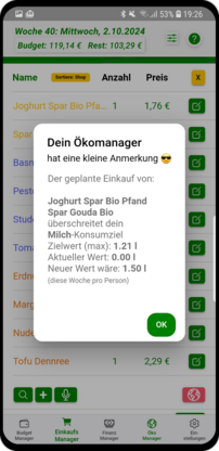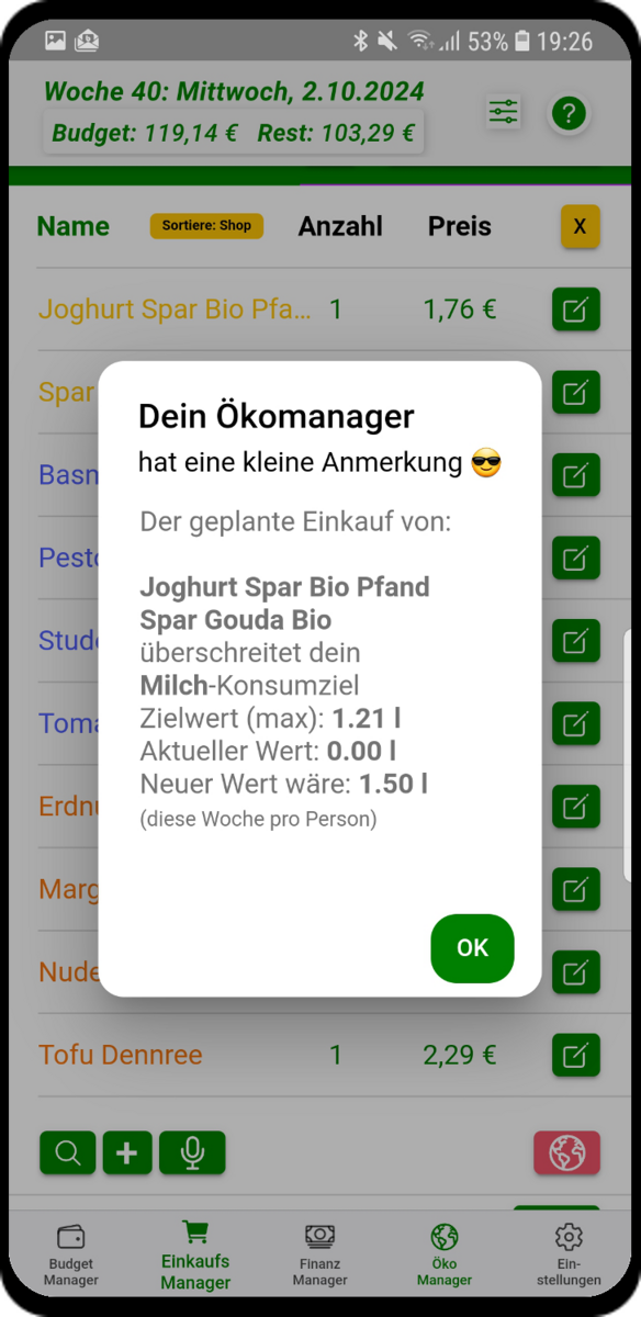 Natürlich hält MEL noch viel mehr für dich bereit: Wenn du auf das "Erde" Knöpfchen drückst (im Bild ganz links rot), rechnet der Ökomanager für dich aus, ob deine geplanten Einkäufe zu deinen selbst festgelegten Ökozielen passen. Im Beispiel würde es für die Milch nicht so hinhauen (Bild in der Mitte).