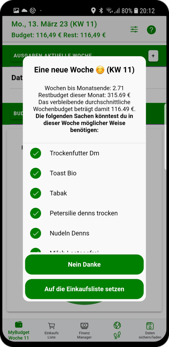 MEL kann aber noch mehr! Bei jedem neuen Wochenstart schlägt dir MEL auch eine Liste mit Dingen vor, die du gebrauchen könntest, je nachdem, was du als regelmäßig benötigt markiert hast.